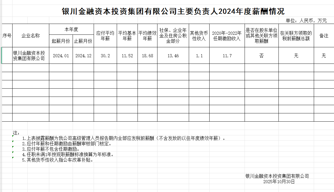 銀川金融資本投資集團有限公司企業(yè)負責人2024年度薪酬情況