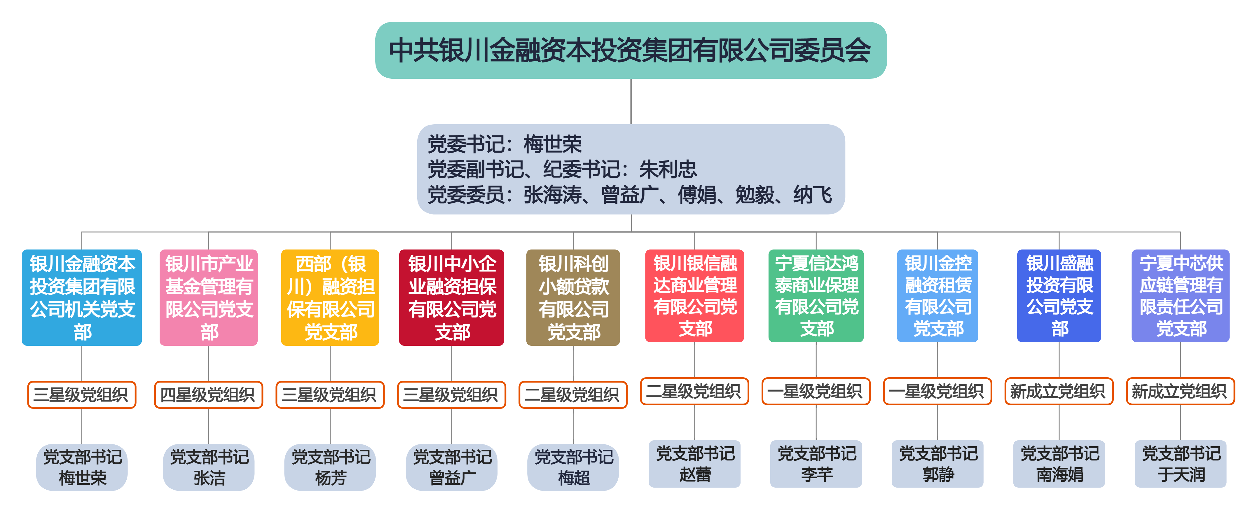 銀川金融資本投資集團(tuán)有限公司黨委于2019年12月6日成立,在銀川市委、市政府及市國(guó)資委黨委和市委金融工委的領(lǐng)導(dǎo)下,堅(jiān)持以習(xí)近平新時(shí)代中國(guó)特色社會(huì)主義思想為指導(dǎo),堅(jiān)持正確的政治方向,宣傳貫徹落實(shí)黨的路線方針政策,嚴(yán)格按照上級(jí)有關(guān)部署開(kāi)展各項(xiàng)工作,有效發(fā)揮黨建在企業(yè)經(jīng)營(yíng)管理中管大局、把方向的政治引領(lǐng)作用。集團(tuán)黨委目前設(shè)立10個(gè)黨支部:銀川金融資本投資集團(tuán)有限公司機(jī)關(guān)黨支部、西部(銀川)融資擔(dān)保有限公司黨支部、銀川市產(chǎn)業(yè)基金管理有限公司黨支部、銀川中小企業(yè)融資擔(dān)保有限公司黨支部、銀川科創(chuàng)小額貸款有限公司黨支部、銀川銀信融達(dá)商業(yè)管理有限公司黨支部、寧夏信達(dá)鴻泰商業(yè)保理公司黨支部、銀川金控融資租賃有限公司黨支部、銀川盛融投資有限公司黨支部、寧夏中芯供應(yīng)鏈管理有限責(zé)任公司黨支部?,F(xiàn)有黨員130人,其中正式黨員123人、預(yù)備黨員7人、發(fā)展對(duì)象5人、積極分子35人。